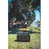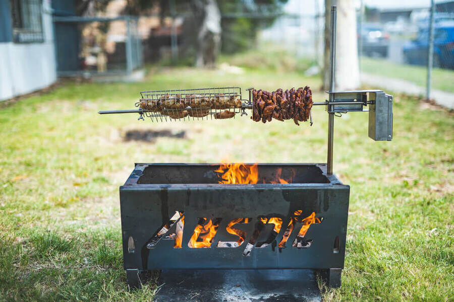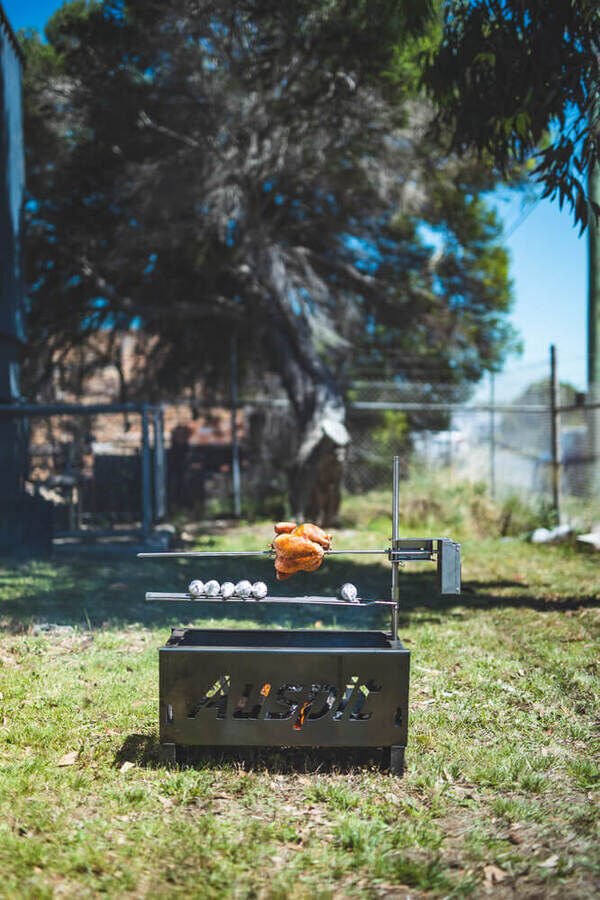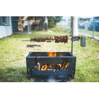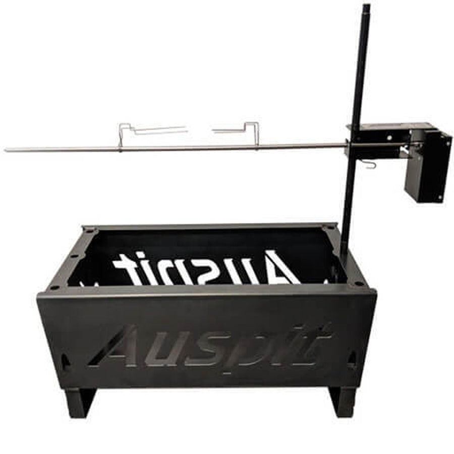 The Auspit Basic | Compact Portable Camping Spit Rotisserie Package is the first of three portable spits packages available in the Australian-designed Auspit range. This battery-operated portable camping spit can cook up to 8kg of balanced meat on its swinging rotisserie skewer. It is unique, easy to use and comes with all the basics you need for your first outdoor camping spit roast.