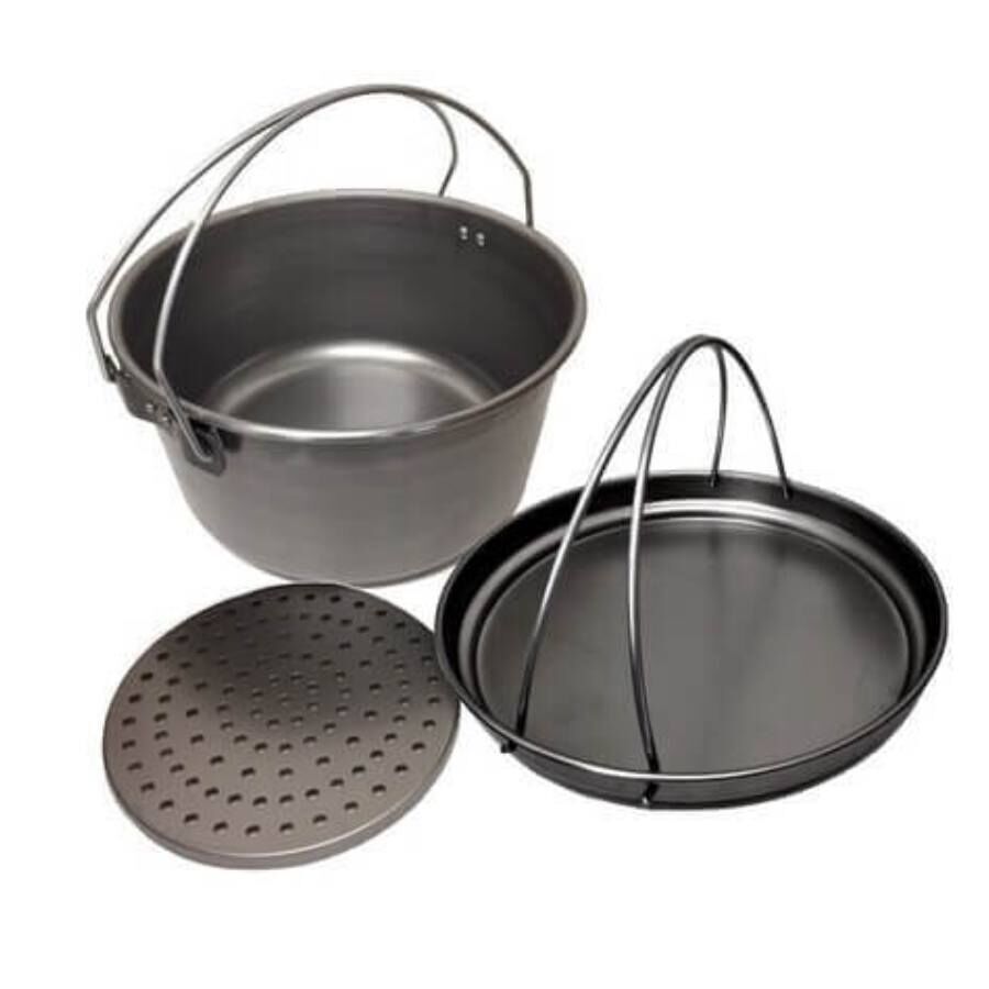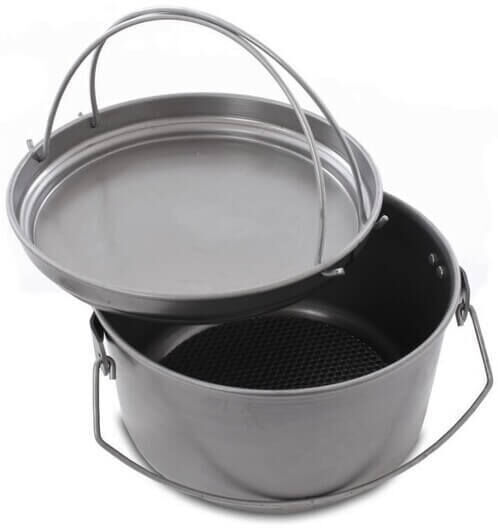 Alternatively, the lid doubles as a handy frypan so you can sit it on top of your hot coals and cook some bacon and eggs for breaky or use the strong lifting handle to suspend the oven from a tripod for cooking or boiling water over an open flame.