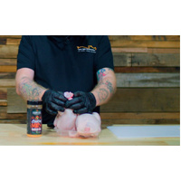 This image show a BBQ Chef using Black Nitrile gloves to protect his hands while removing chicken from a skewer.