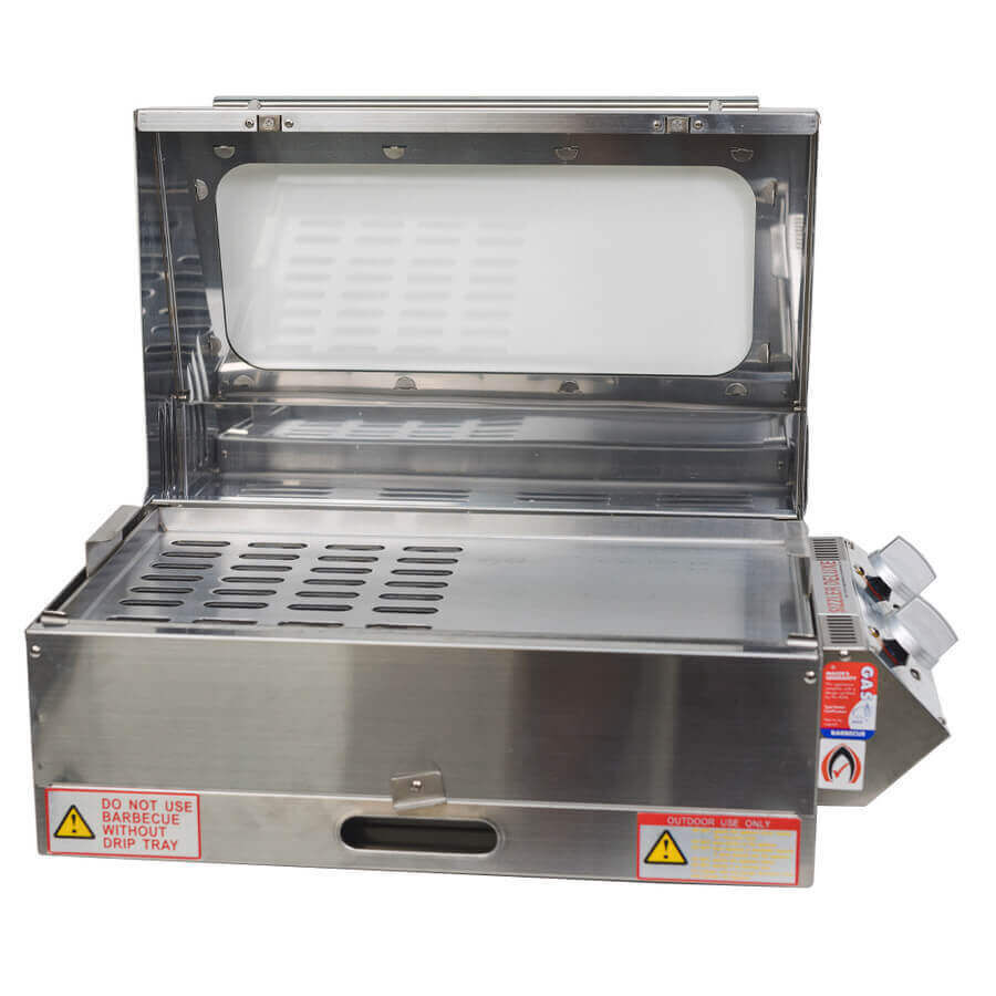Introducing the Caravan BBQ - Sizzler Deluxe High Lid - 1/2 Grill & 1/2 Hotplate. A compact, sturdy, and versatile BBQ perfect for caravanning and portability. Ideal for cooking up a feast with its 1/2 grill and 1/2 solid plate griddle, the Sizzler Deluxe is built to handle your next outdoor adventure with ease.