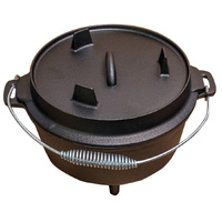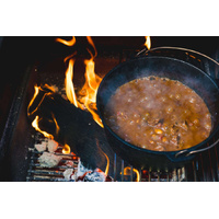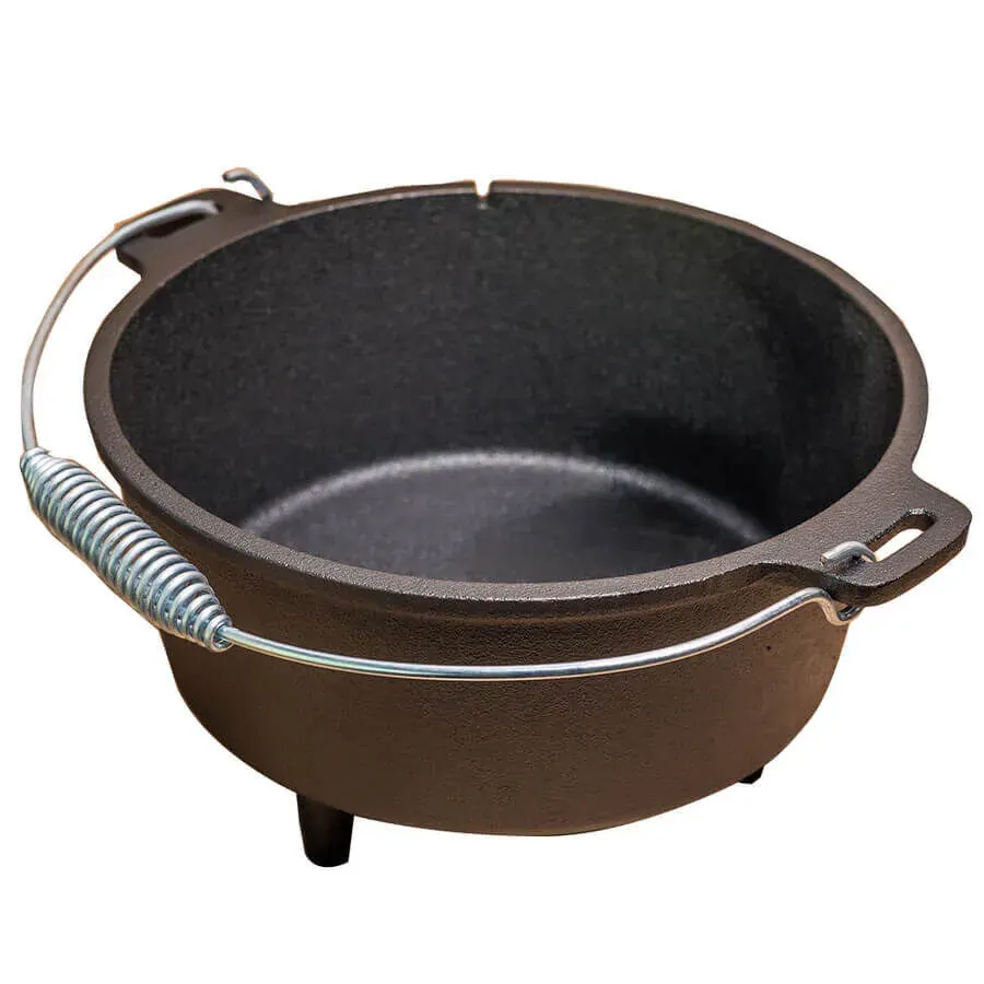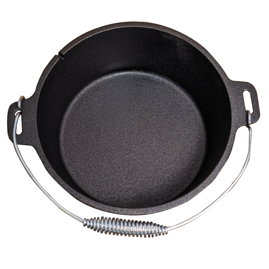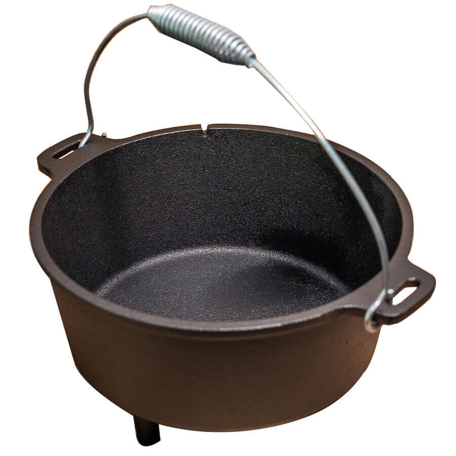 The Dutch Oven comes pre-seasoned from the factory and is a thick-walled cooking pot with a moulded lid to give a tight fit around the pot. This makes it the perfect pot for cooking slow-cooked meals by keeping all the moisture and juices in your food. The deep lid, also called a skillet, doubles as a full-size pan. This now expands your cooking options while camping, just turns the cast iron dutch oven lid over to fry your bacon, eggs, burgers and pancakes.