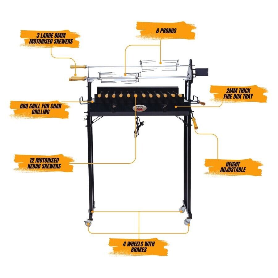 | Motors | 12/240V 5RPM 13kg motor for larger roasts and 240V 2RPM 9kg motor for kebabs |
