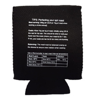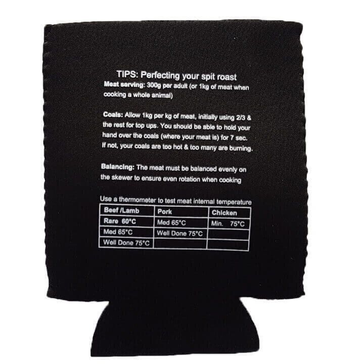 Like to have a coldie while cooking your spit roast? Not only will this neoprene Flaming Coals Stubby Holder keep your drink cool and hand warm, its also a quick reference guide for perfecting your spit roast.