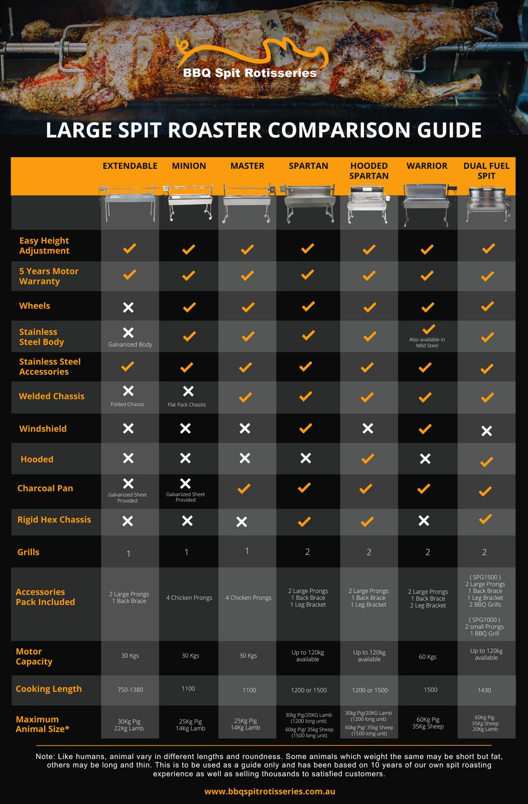 | Suitable For | Whole lambs, pigs, goats, chickens and large roasts |