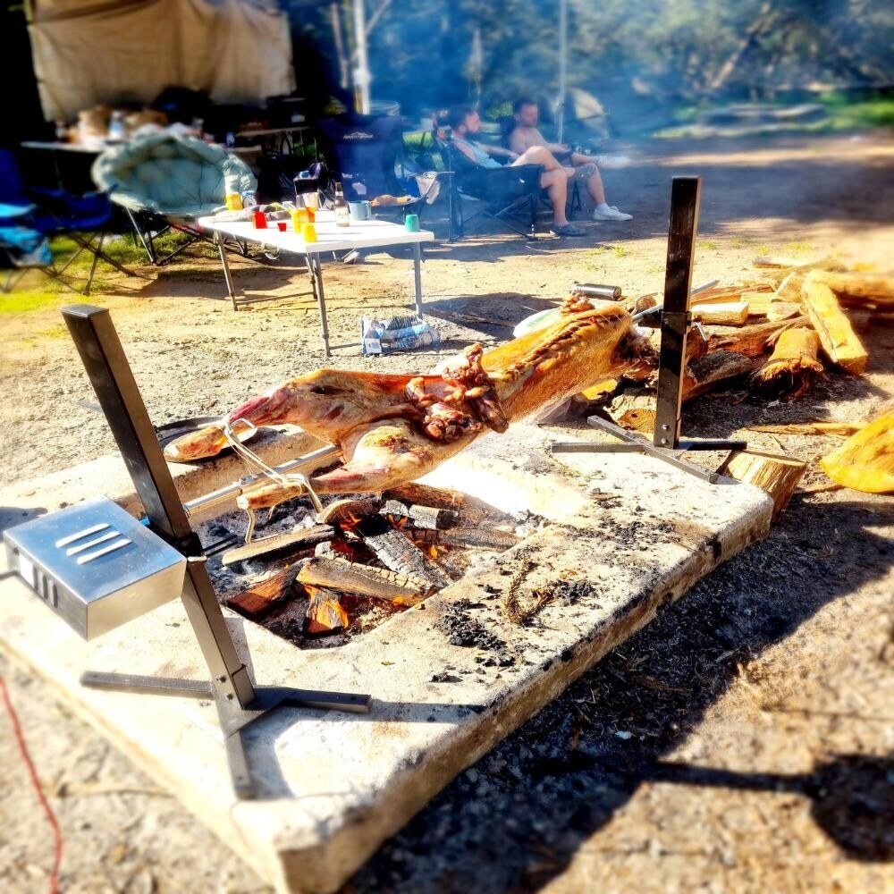 Designed with durability in mind, this Heavy Duty Portable Camping Spit Roaster outperforms standard models on the Australian market. Featuring a solid stainless steel 200cm skewer, extra tall supporting legs and a sturdy height adjustment mechanism, it can handle whole animals with ease while staying steady over your firepit or 44-gallon drum.