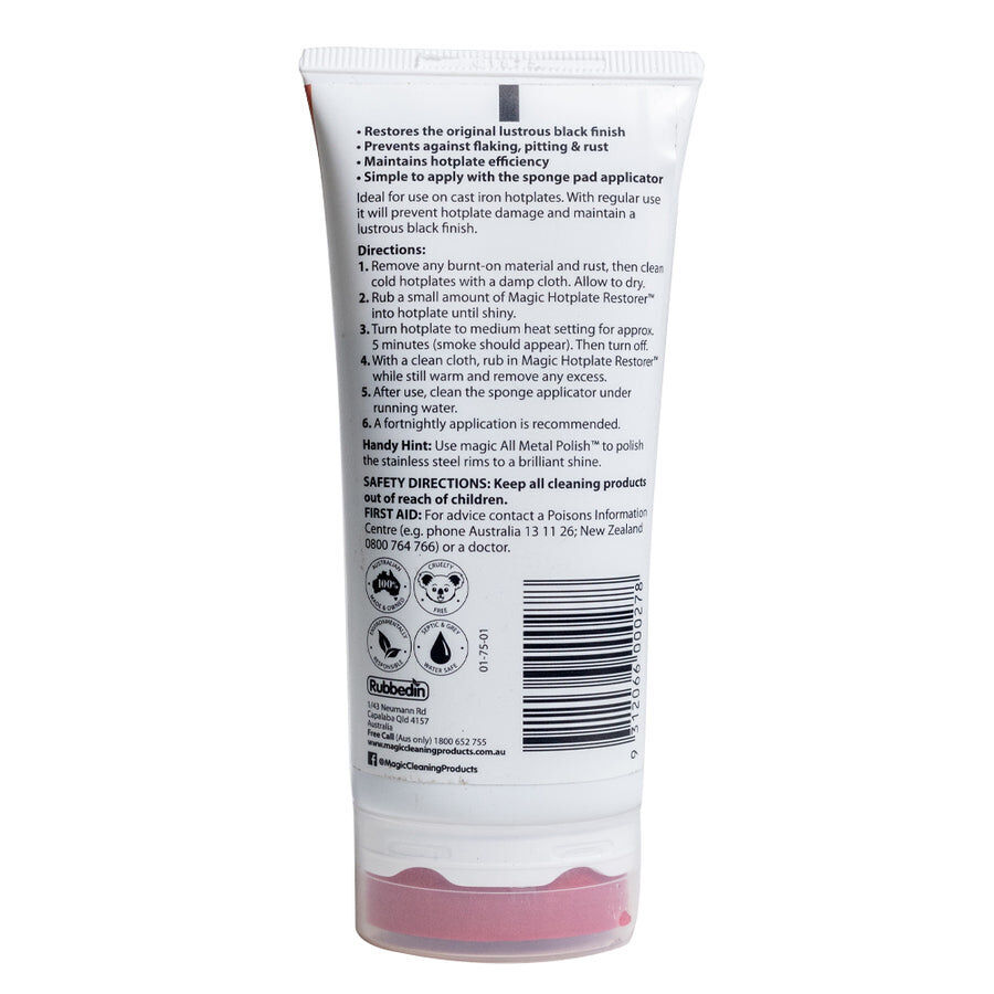 The tube comes with a built in sponge pad for easier application and guaranteed results. Magic Hotplate Restorer is Australian made and owned, is environmentally responsible, cruelty-free, septic and greywater safe.
