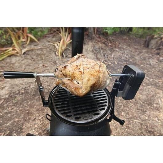 The Ozpig Big Pig Rotisserie Kit is your Ozpig Big Pig's perfect addon for preparing your favourite meat and cooking for a group of people. The battery-operated motor (powered by 2 x D cell batteries not included) perfectly spins your meat as you sit back enjoying the most relaxing way to cook on a spit, with your favourite drink and the aroma of your roast on an open flame. Simply skewer the meat, set the adjustable height and let it do its magic. The OzPig Rotisserie kit will allow you to spit-roast whole chickens and larger pieces of beef, pork or lamb on the OzPig