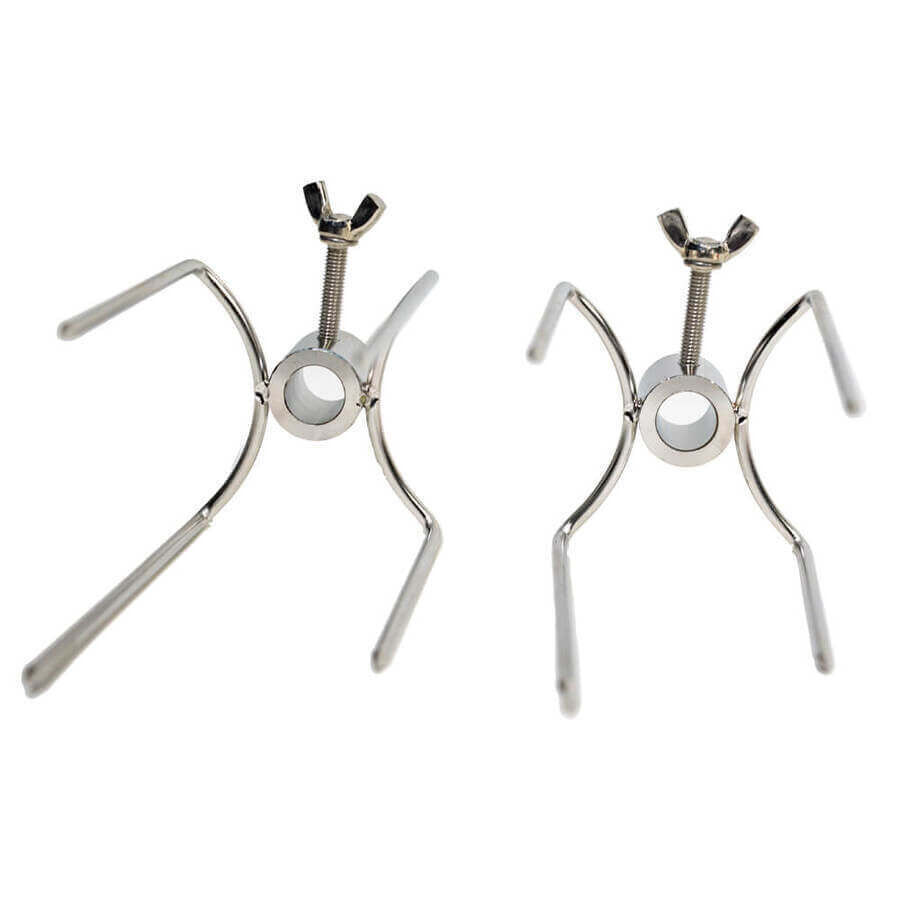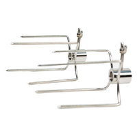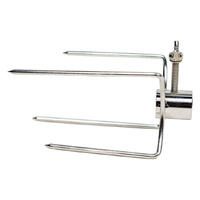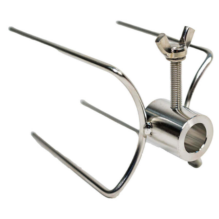 Prong Rotisserie Fork for Chicken - 14mm round is suitable for affixing chickens, gyros, rolls of meat or pretty much any meat other than whole animals to a skewer. This 4 spike design is the most used prong/fork when it comes to spit roasting due to its versatility. The long screw nut ensures you can fasten the prong tightly to the skewer to remove movement while cooking. Suitable for square skewers up to 14mm diameter corner to corner or your standard 8-10mm square skewer. It will also suit 8mm to 14mm round skewers as the locking bolt is long enough to penetrate through to the skewer.