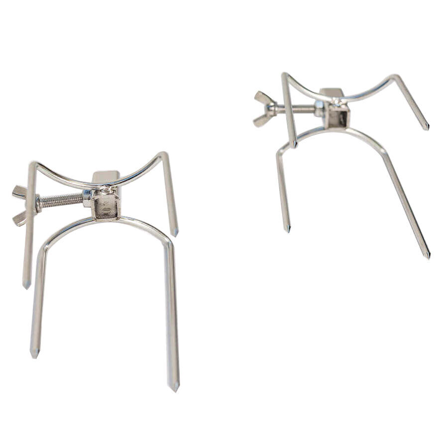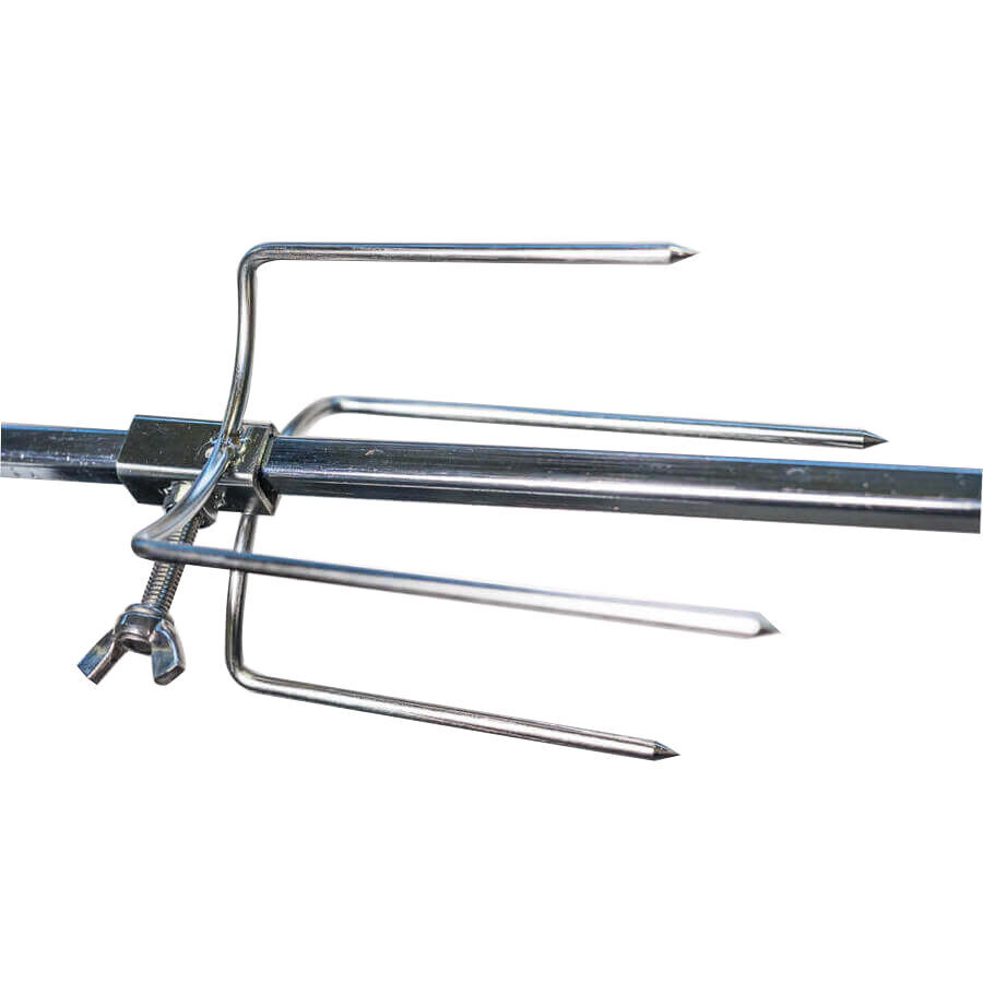 Small 4 Prong Rotisserie Forks for Chicken are suitable for affixing chickens, gyros, rolls of meat or pretty much any meat other than whole animals to a skewer. The long screw nut ensures you can fasten the prong tightly to the skewer to remove movement while cooking. Suitable for square spit roast skewers up to 10mm square in size. Will suit 6mm and 8mm square skewers also as the locking nut is long enough to penetrate through to the skewer