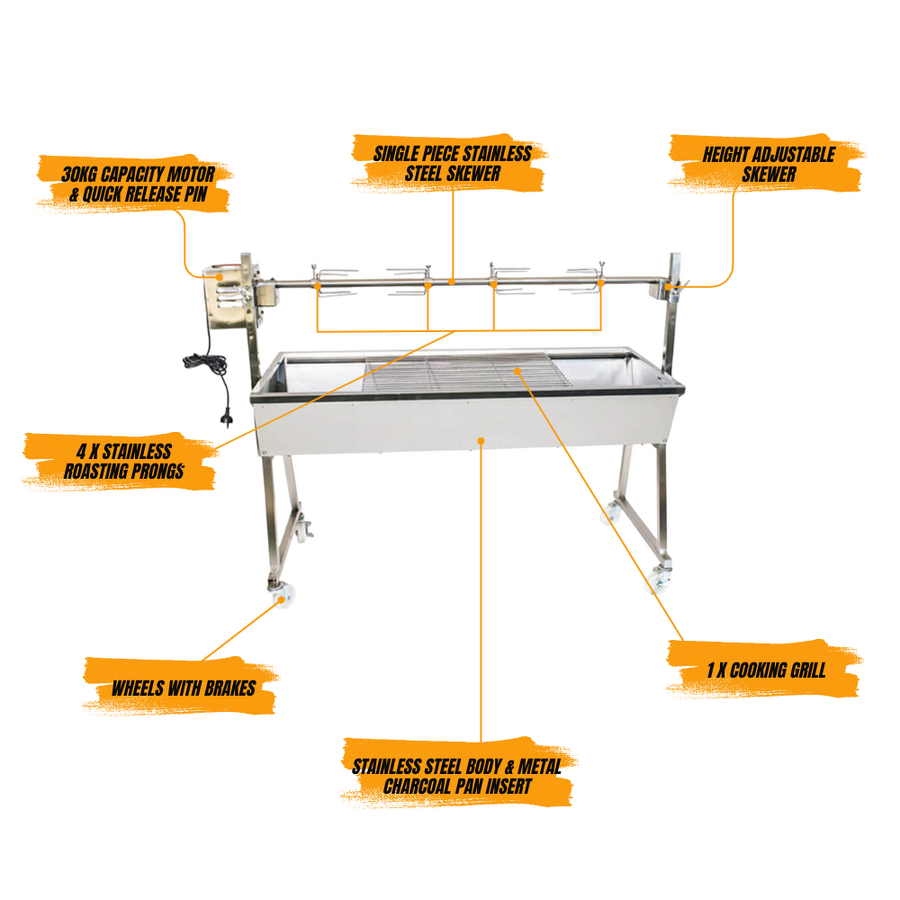 If you're looking for a great quality stainless steel spit roaster without spending a fortune, this is it. The Minion 1200mm Stainless Steel Spit Rotisserie is built to last and designed for versatility. Whether you want to cook gyros, chickens or roasts, this spit roaster delivers every time. It can even handle a small suckling pig (under 15kg) when paired with the Advanced Spit Roast Pack.